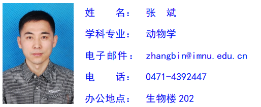 张斌,男,汉族,生于1979年,祖籍辽宁康平,理学博士,教授,博士生导师。太阳成集团tyc33455副经理,内蒙古自治区动物学会副理事长,内蒙古自治区“草原英才”。先后入选内蒙古自治区“青年创新人才”一层次、内蒙古高等公司“科技领军人才”。研究领域包括动物系统进化、干旱区环境与动物演化、有害生物防控、媒介生物学与病原控制等。主持国家重点研发计划课题1项、国家科技部基础资源调查专项课题共1项、国家自然科学基金项目3项、省部级科研项目10余项。发表研究论文70余篇,SCI收录40篇,出版学术著作4部。