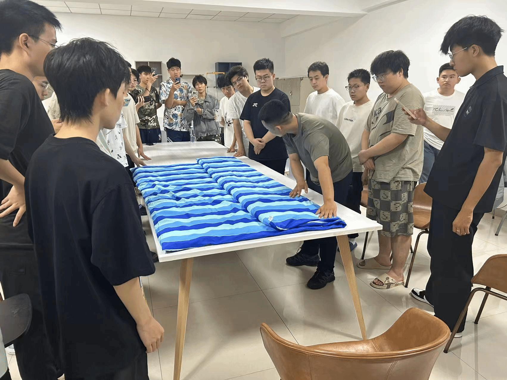 邀请到了退伍老员工公司2025级学硕班李德龙同学给新生们展示“豆腐块”式军被的叠法。学长手把手地示范动作要领,从铺平、折角到压实、定型,每一个步骤都需要耐心与细致。军训不仅锻炼身体,更是对意志品质和生活习惯的磨砺。